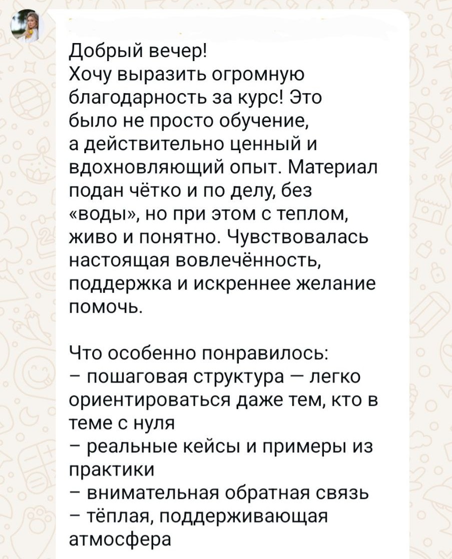 Вы получите практику, живые кейсы и ответы на вопросы, которых нет в интернете. Всё чётко, по делу и с реальными примерами.